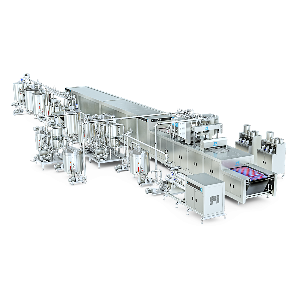 ADM-SS-600 Yumuşak Şekerleme Üretim Hattı, karamel, pektin bazlı jöle ve fondant gibi çeşitli yumuşak şekerlerin üretilmisi ve kalıplanması için tasarlanmıştır.